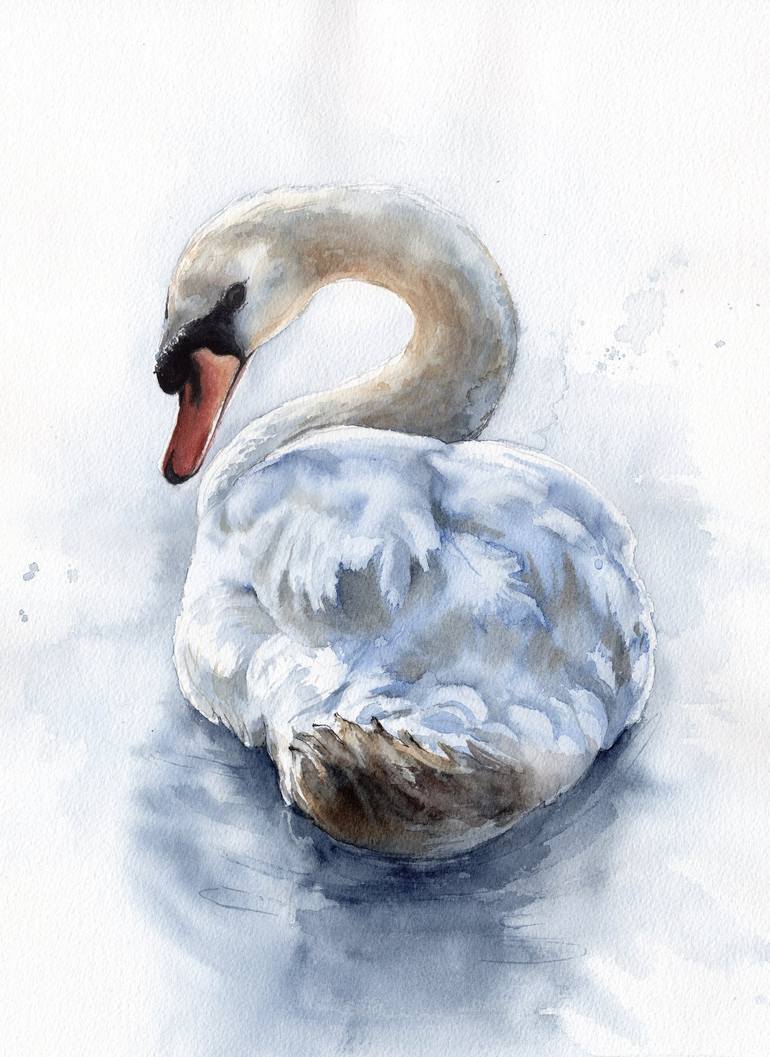 This stunning watercolor painting captures the serene beauty of a majestic white swan gracefully gliding on a calm blue lake. This painting is a perfect addition to any art collection, bringing a sense of peace and tranquility to any room.