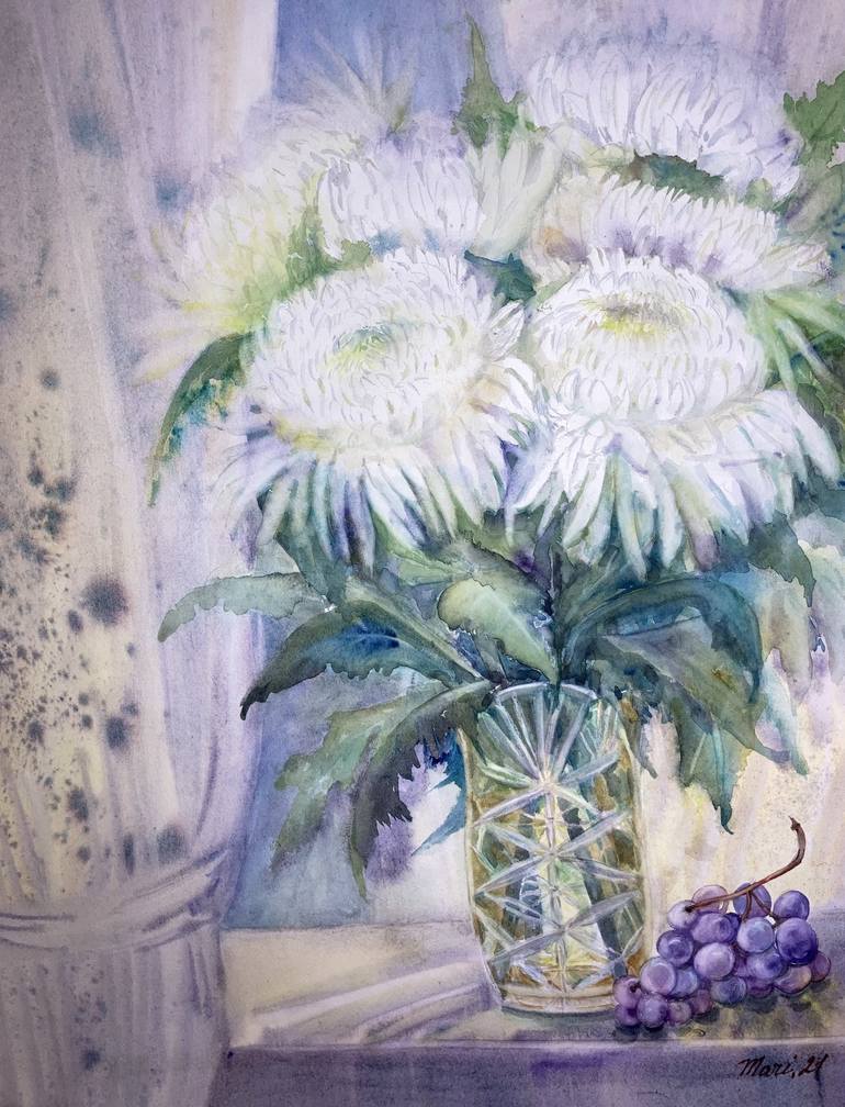 White chrysanthemums in a crystal vase on a light background. Watercolor/paper