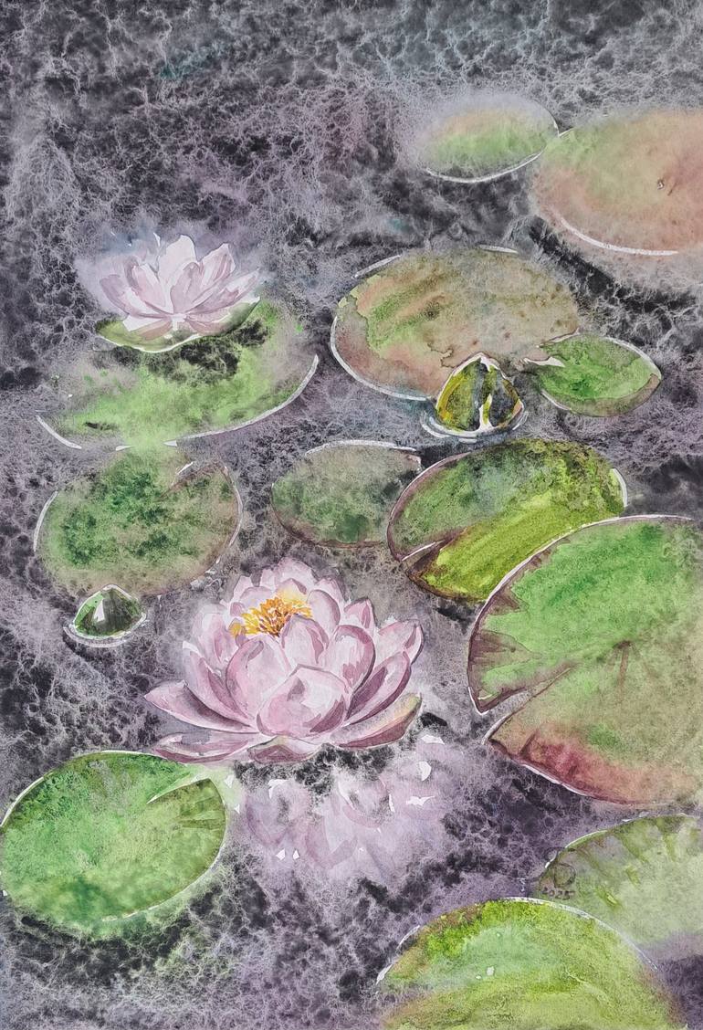 Gentle weite lilies float on the water's surface like glowing candles lighting the way to the unknown. The dark depths below whisper secrets, tempting the imagination with what lies beneath. Soft watercolor strokes highlight the delicate beauty of the blossoms, contrasting with the enigmatic depths....