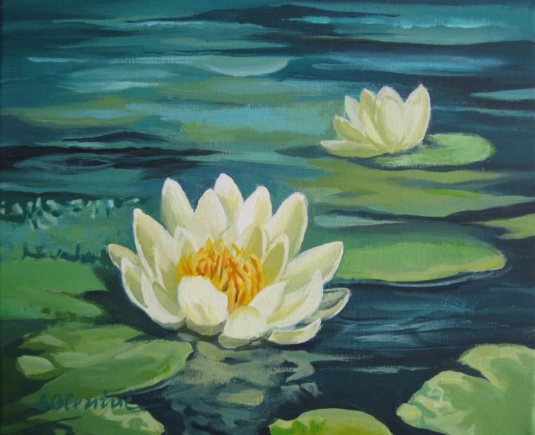 Acrylic painting on canvas, pond, white lily. Painted with love.