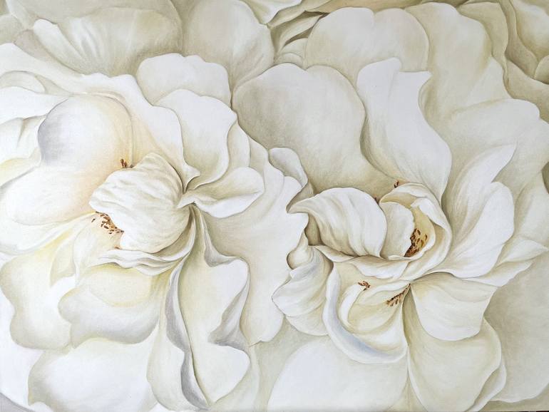 White roses Oil, canvas cotton on a stretcher 90*120 cm January 2023 White flowers symbolize pure, sincere, virgin love, tender sympathy. They can be presented as a gift not only to the bride, but also to the girl on the first date. A bouquet of white roses in this case will mean that a man admir...