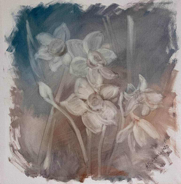 White shadow of ghostly flowers Gently Floral Original Painting Delicate daffodils Boho-eclectic interior Art Size 20x20 inches (50x50 cm ) 2023 Oil paints on stretched canvas with wide edges The edges are clear Signed Ready to hang There is a moment in painting when continuation can completely...