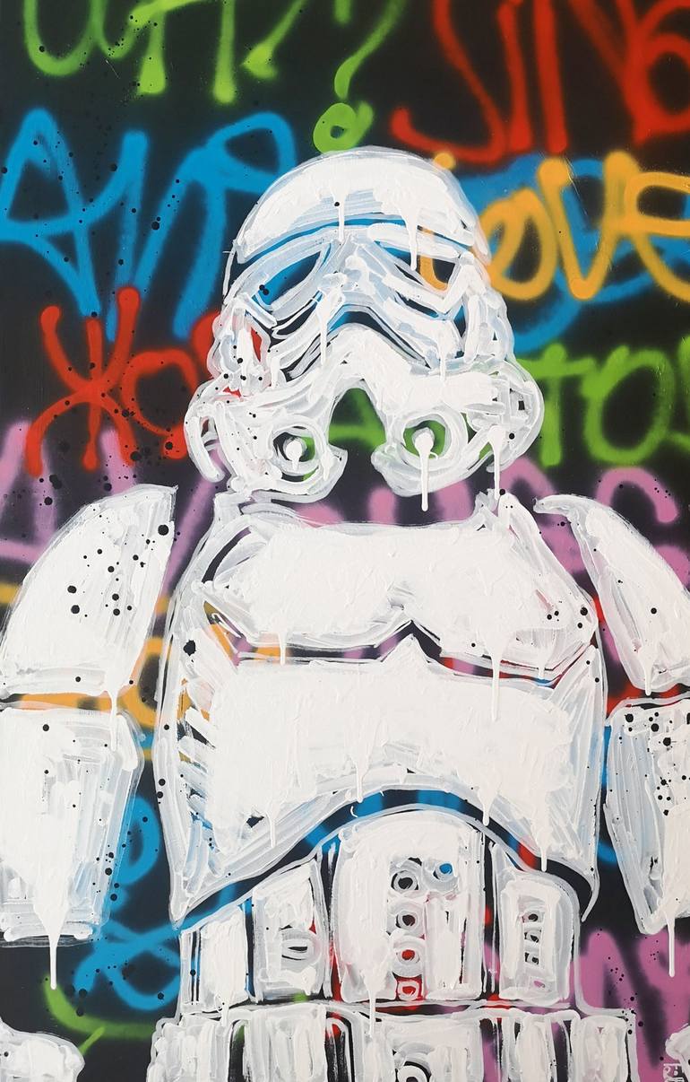 Description : un storm trooper (soldat de l'empire) en mode street art. Star wars (la guerre des étoiles) en graffiti. Des inscriptions graph rouge bleu vert jaune puis un buste de trooper dessus. Il est de face, en légère contre plongée. Genèse : un travail sur le graph, plus pour l'envie de faire...
