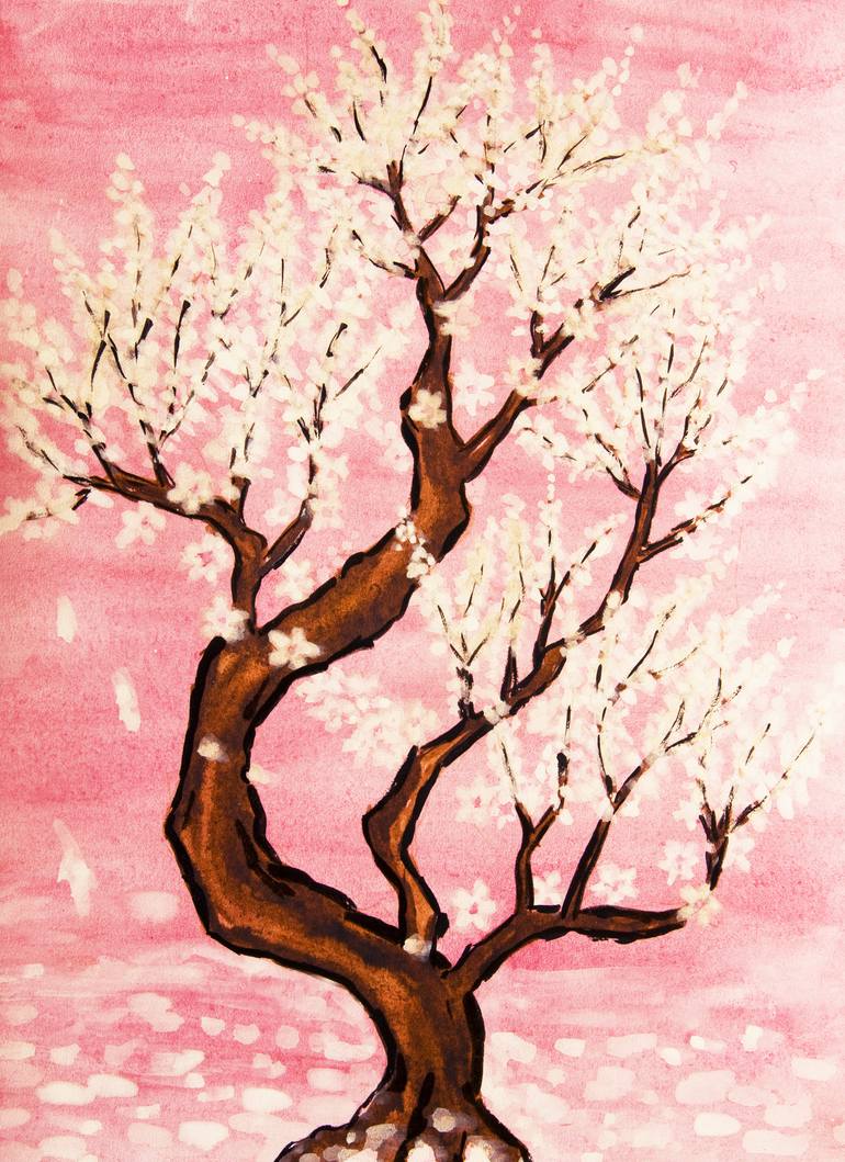 White tree in blossom on pink background, influenced by traditions of old Chinese art and beauty of spring. Original of this painting is already sold, but it is possible to buy prints. I also have other not sold pictures of this seria - spring trees - in my collection "Spring landscape":