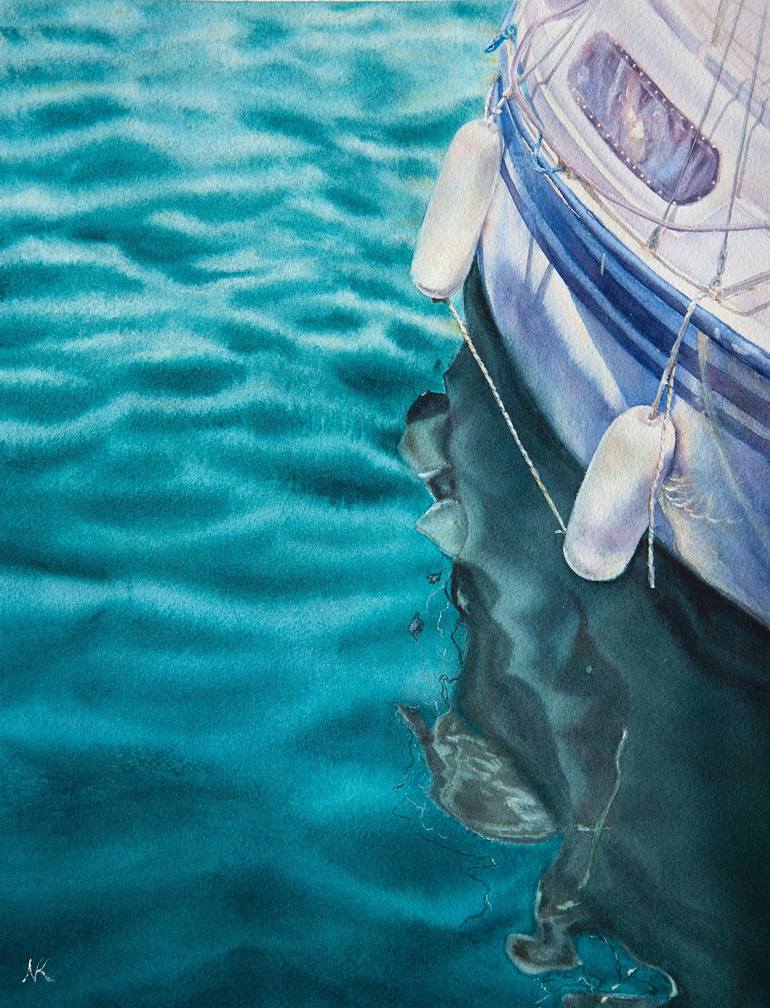 In this enchanting watercolor painting, turquoise sea waves gently cradle the reflection of a white yacht, creating a serene seascape. Delicate strokes weave a tale of timeless elegance, with the sailboat emerging as a captivating focal point amidst the tranquil waters. Each brushstroke invites to i...