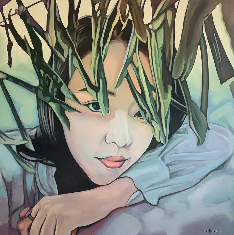 A little girl, sent me a picture, eyes and demeanor attracted me. The delicate tones of the medium of oil painting and the popular pop style inspired my expressive impulse. Through the flowers and plants, the charming eyes of a young and beautiful girl highlight the pure quality of life in the cool ...