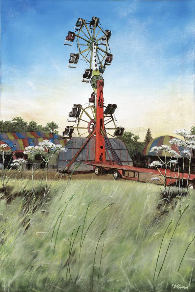 Ferris wheel (or double-Ferris wheel) Painted from multiple photo images early in the morning, before the crowd came in. The carnies had set it up the night before. From the 2018 Placer County Fair in Roseville, California.