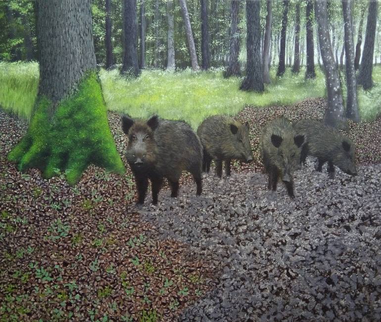 Painting is oil on canvas. It portrays the shy nature of european wild boars in summer and the contrast of dead leaves and lively grass in the forest.