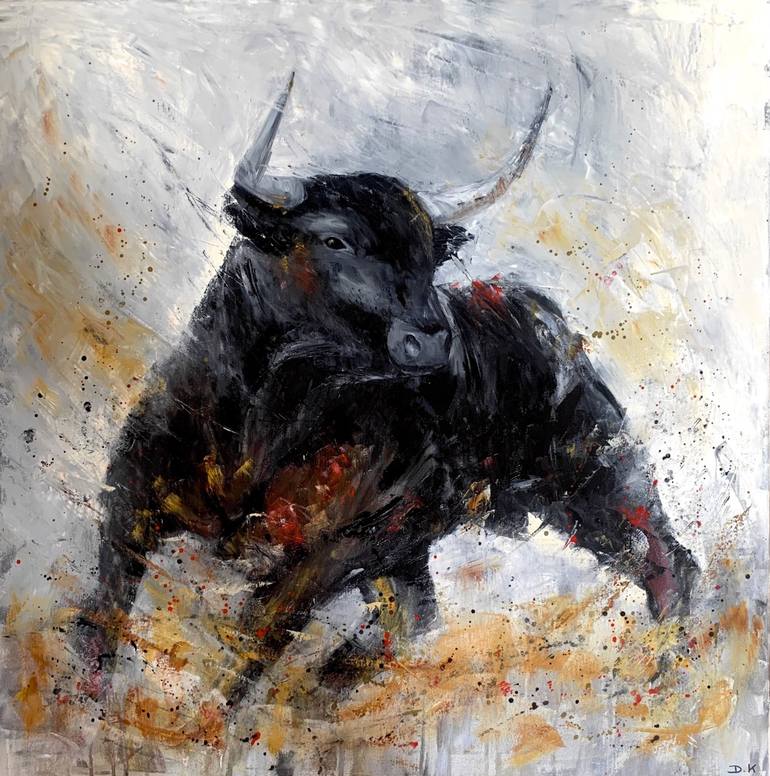 This oil painting depicts a powerful black bull in all its strength and intensity. The beast is captured in motion, its massive body standing out against a textured, expressive background, where bursts of light and abstract touches add drama. The bull's dark hues, mixed with red and orange accents, ...