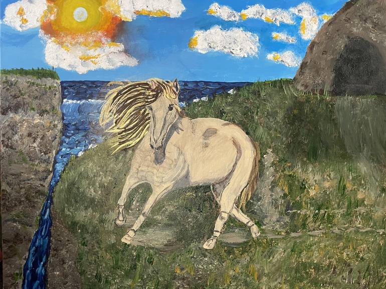 This is my original acrylic painting of a horse named Wildfire just like this song. This horse has wild spirit and is now playing chicken with a cliff just having fun. She has a golden mane flying in the breeze. I’ve always loved horses and freedom and the ocean that’s why I chose this subject this ...