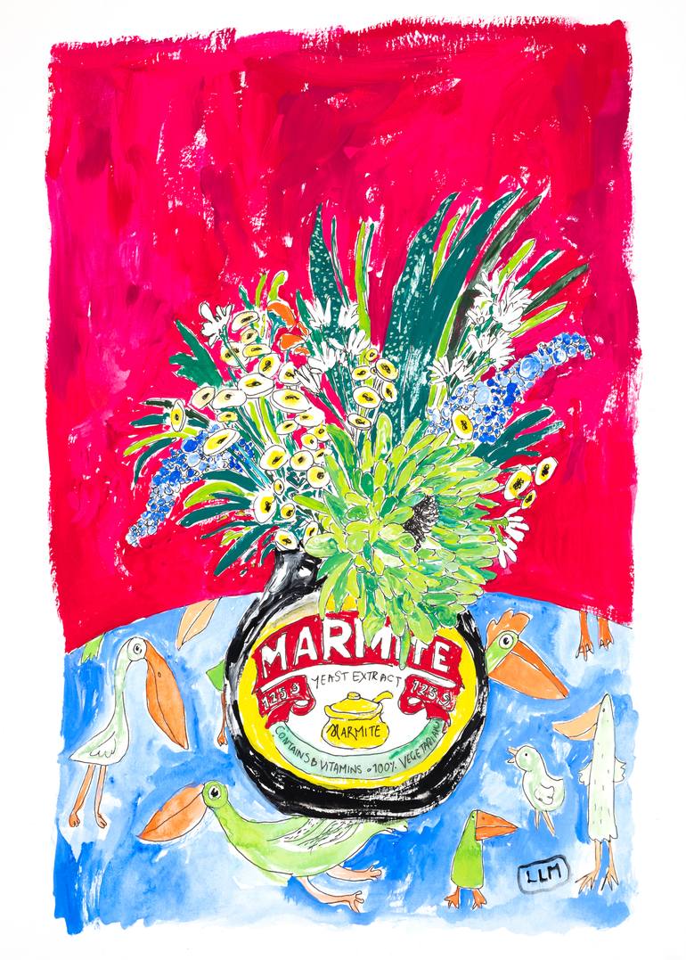 This bright and cheerful composition features a bouquet of locally gathered wildflowers tucked into a rinsed out Marmite jar. The vase rests on a tablecloth painted with jaunty birds and the bright, expressively painted pink background finishes the piece.