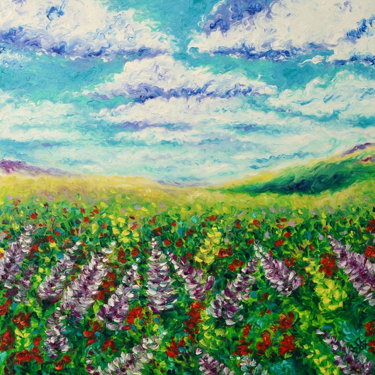 I painted this landscape dreaming of summer. Long beautiful, magical days hiking and then sitting back watching the clouds float by. Created with generous textures and colors. It is always my intention to bring my love of nature, light and relaxation to my viewer in harmony with a sprinkling of wond...