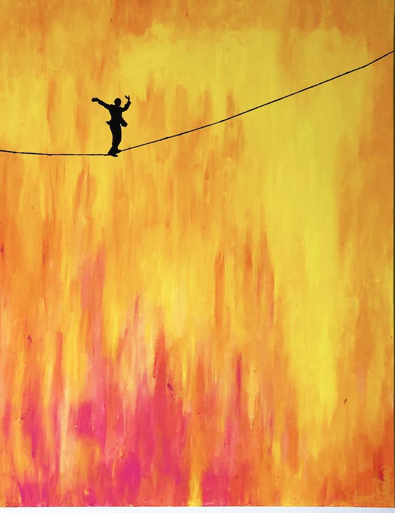 This original painting is entitled 'Willing To Take Risks' and depicts a figure daringly walking a tightrope, with a vivid firery colors palette.