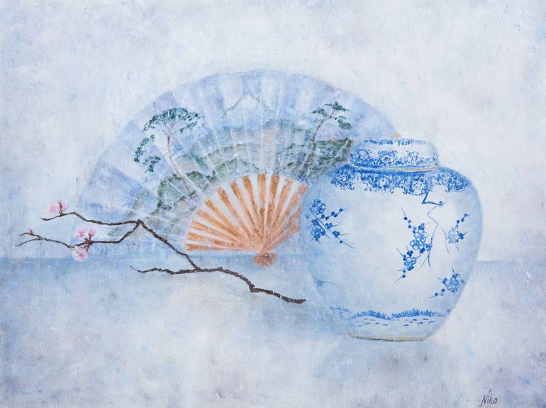 Wind Catcher Oil painting on canvas 63x47 cm Year: 2023 ‘Wind Catcher’ is the original artwork made on canvas in an oil painting technique. It is a laconic pastel colored oriental style still life depicting a traditional Japanese white and blue porcelain jar, antique hand fan and Sakura - a cherry...