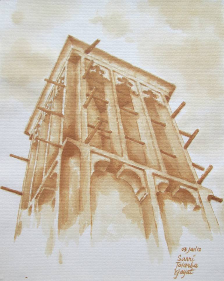 Wind Tower or wind catcher is called Barjeel in Arabic, a wind tower are the Gulf’s unique form of traditional non-electrical air-conditioner used in old times during the hot summer months and is an ancient architectural element of UAE houses. Tea/ tea stain on 180g/sm cold press acid free watercol...