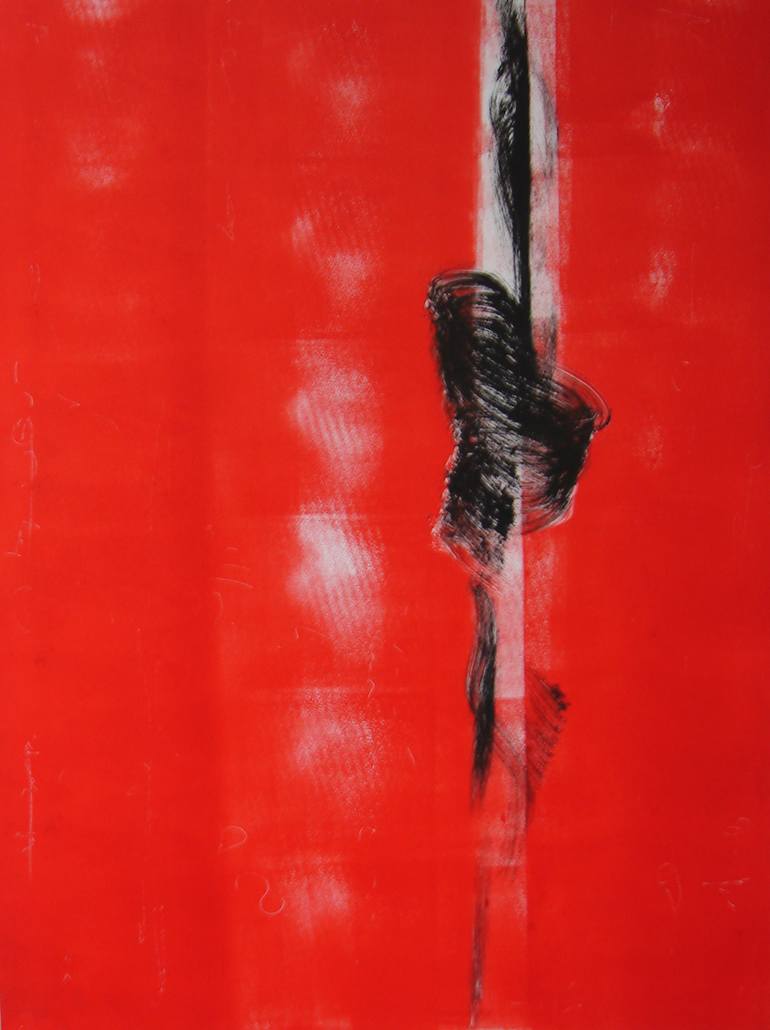 Beautiful red original monotype (one-of -a-kind) printmaking on paper with black sumi brush stroke. Echoes of figurative. Inspired by my study of sumi painting. 24"x18" image on arches acid free paper 30"x22". unframed. shipped gently rolled
