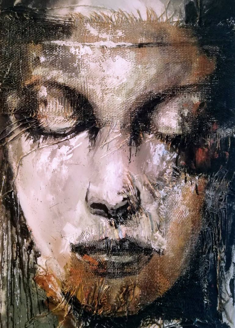 Portrait of a young woman with eyes closed. Mixed media on canvas.