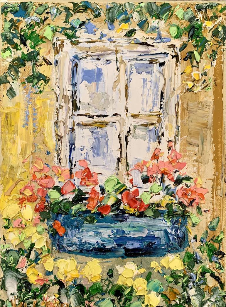 Window And Flowers Impasto Oil Painting On Canvas *Title: „Old window“ *Size: 7.1"x 9.4" [18 x 24 cm] *Original handmade oil painting on canvas by brush and palette knife. *Made by me - Vilma Gataveckiene. This is not a copy or a print. *Signature on the front and on the back. Ready to hang...
