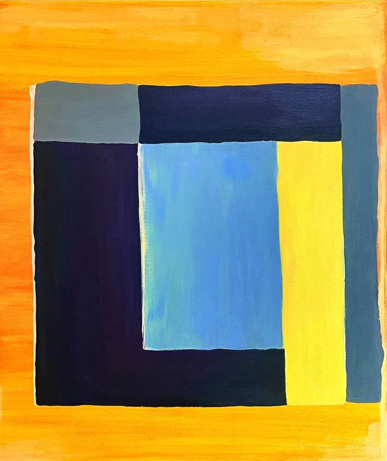 The painting "Window of Color" is a play of light, space, and form embodied in minimalist geometry. Deep shades of blue, gray, and black create a sense of perspective, as if opening a window into another world. The bright yellow background adds warmth and energy, filling the artwork with vitality, w...