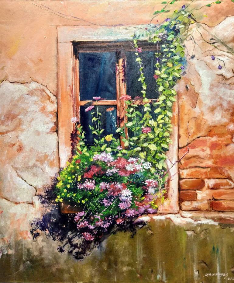 A leftover home window overgrown with wildflowers and the old wall bricks textures falling apart. Portrays the life & melancholy of emotion through expression of paintbrush and colors.
