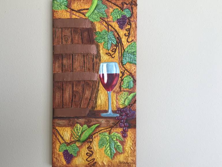 This interior picture shows a vine branch. It can be seen that many clusters are massive, the vine bends under their weight, the berries on some clusters are already dark, ripe, juicy, and some clusters are just starting to ripe. “ Wine and grapes ”- a life-affirming, realistic still life. The compo...