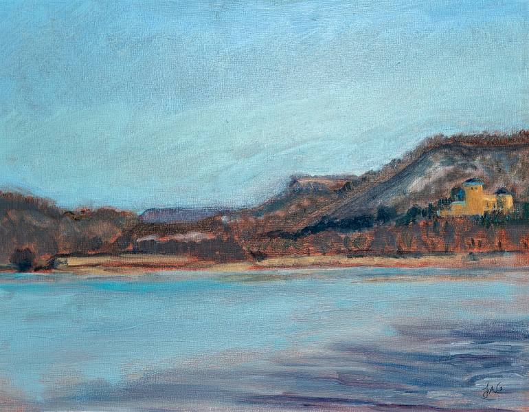 Winter in the Driftless Region of the Upper Midwest showing the Mississippi River Valley. I love the deep muted colors of the bluffs and the stark contrast of the sky and ice. Winter on the river gives me a sense of clarity. Oil on hardboard felt right for this work.
