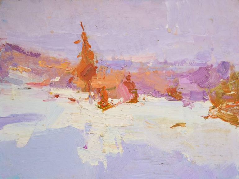 Brushstrokes blend soft pastels with vibrant oranges, depicting a serene landscape. The scene suggests an impressionistic view of a snowy field with colorful trees or bushes.