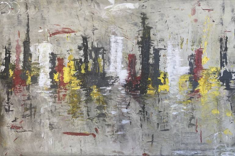 This is a unique original painting, acrylic on canvas. It is a cityscape from a winter day. The prevailing overcast sky blends almost imperceptibly with the ground, broken up only by the reflections and natural light bouncing off the buildings themselves. The mix of bright red and yellow countera...