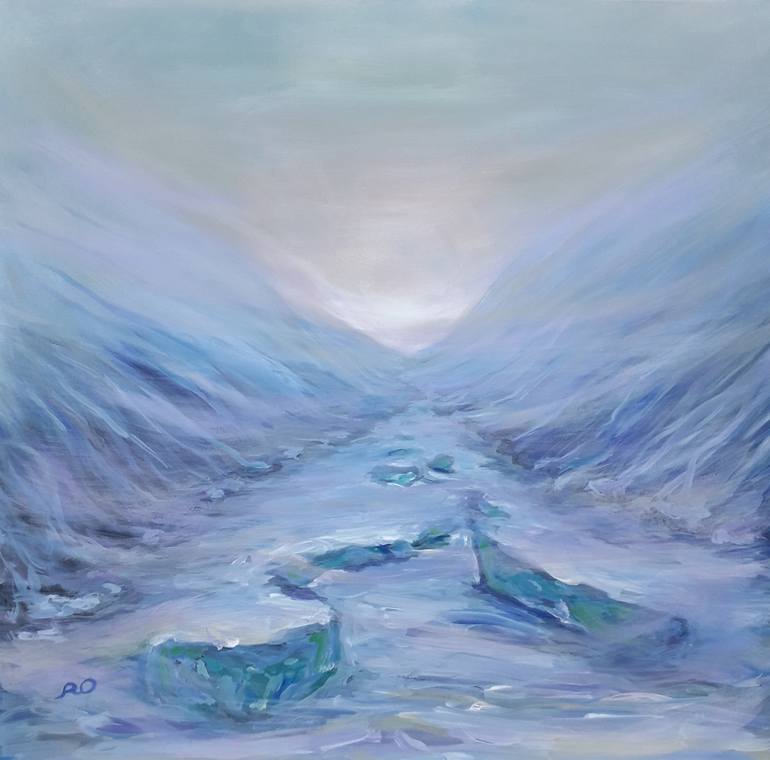 Original painting "Winter Fog over a frozen mountain Lake" Size: Height 24 x Width 24, Depth 0.6, Inches. Materials:Acrylic on Canvas, Acrylic Pens. Subject: Landscape. Style: Impressionism, Contemporary, Modern. It depicts the majestic path from the permafrost to the dream world where...