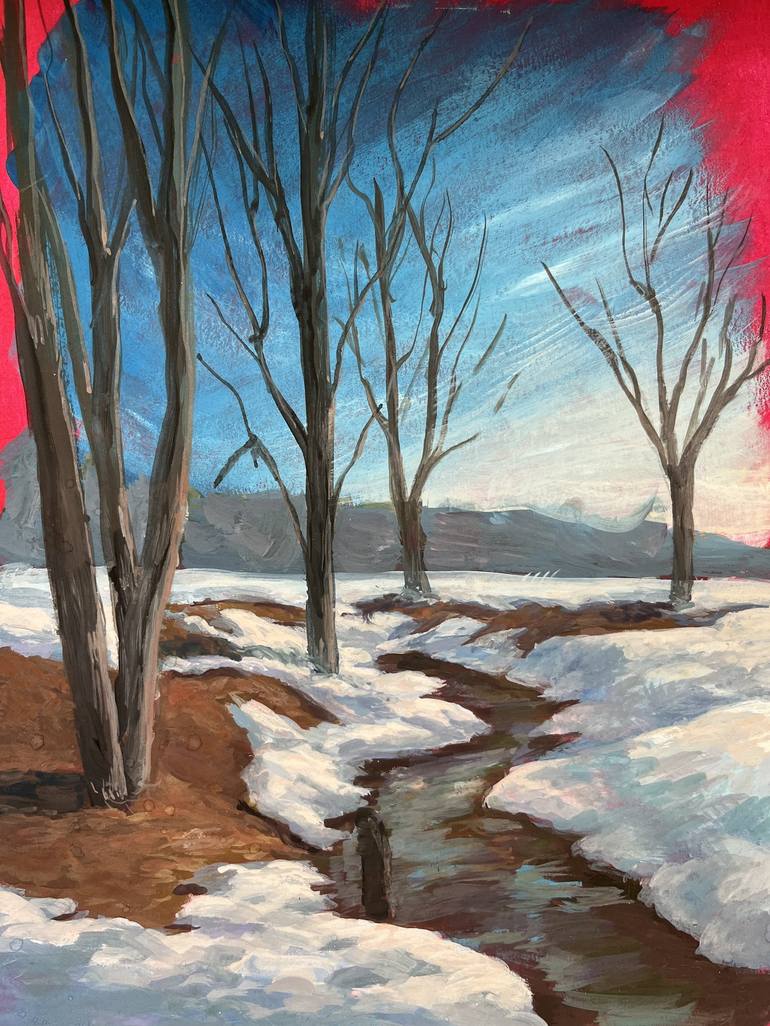 This original gouache painting captures a fleeting moment between winter and spring — a quiet forest scene where melting snow reveals patches of warm earth and a gentle stream begins to flow again. Created on paper with a size of 21 x 29 cm, the piece is rich in contrasting emotions: the crisp cooln...