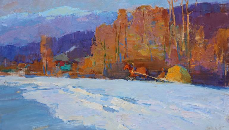 ARTIST: Alexander Kryushyn WORK: Original oil Painting MEDIUM: Oil on Canvas YEAR: 2024 TITLE: "Winter Morning in the Mountain" DIMENSIONS : 40 х 70 х 3 cm. / 15.7 x 27,5 х 1,2 in. "Winter Morning in the Mountains" captures the tranquil beauty of a snowy landscape illuminated by soft morning light....