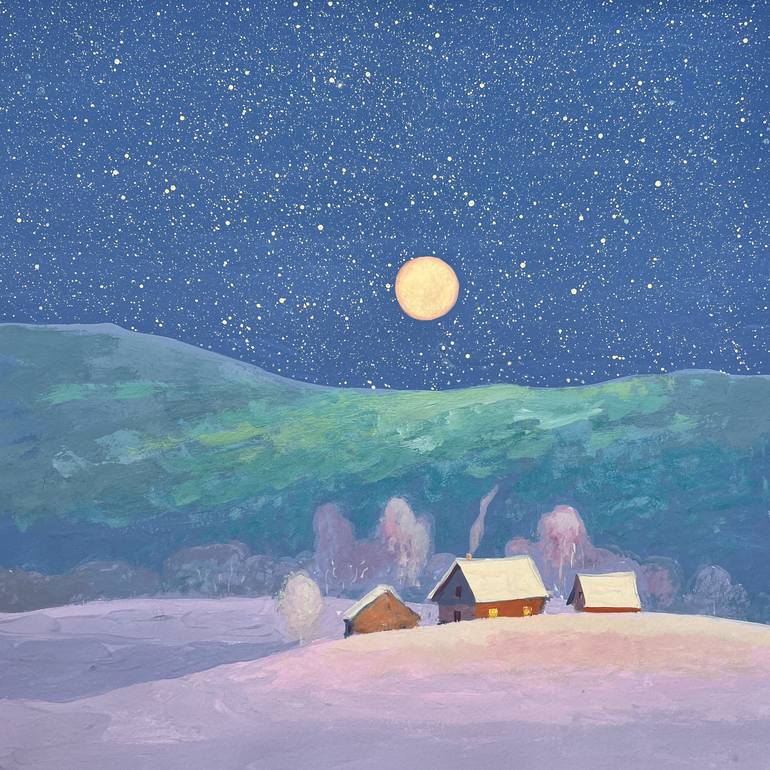 This artwork captures the enchanting serenity of a winter night as it gently embraces a Carpathian village. Under a star-studded sky, the radiant moon casts its silvery glow over snow-blanketed houses and rolling hills, weaving a seamless harmony between nature and the quiet rhythm of human life. ...
