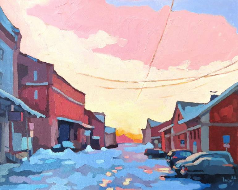 Original fine art oil painting, "Winter evening at the Central Market". Beautiful winter evening lights at Central Market in Riga, Latvia. Canvas stretched on wooden frame and the sides are completely painted, the painting is ready to hang. (No frame or stretching needed.)