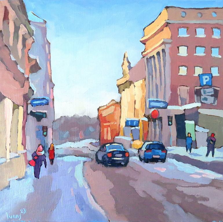 Original fine art painting - "Winter in Riga. Skolas street" Lovely winter cityscape, snow and ice at Skolas (School) street in Riga town, Latvia.