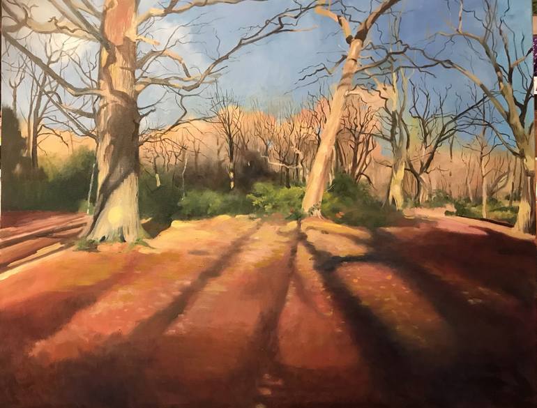 The Winter shadows are long and stretch out across the forest floor. The afternoon sun is low and has a warm glow, tinting the bare branches pink. It’s a cold Boxing Day and the contrasting light inspires this painting.