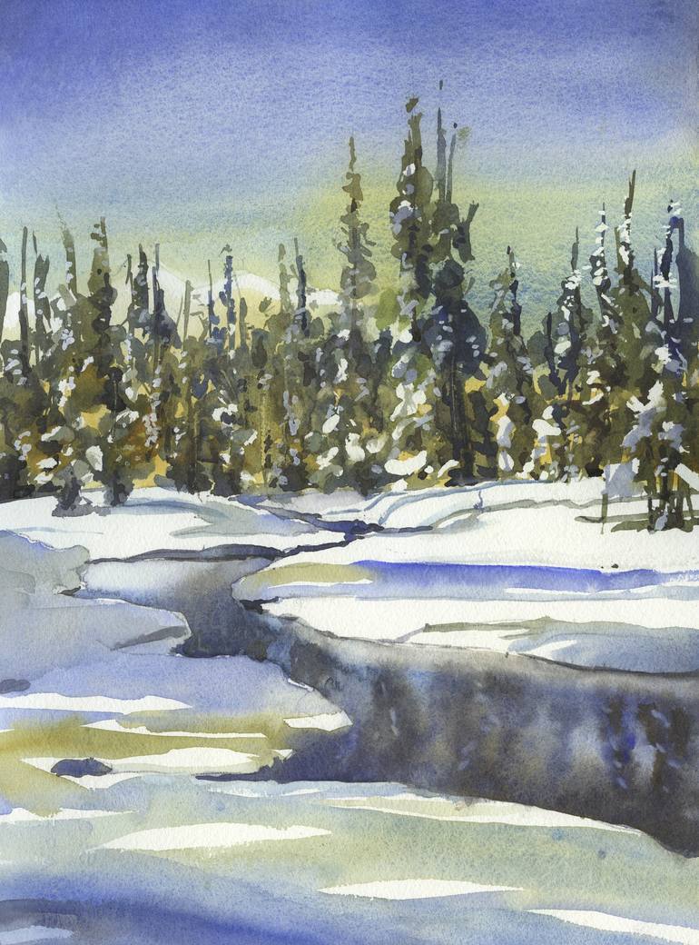 Snowy mountain landscape art. Watercolor painting snowy mountains evergreen trees stream landscape artwork blue. 11x15" original watercolor on 140lb professional paper. Hand signed by artist (not pictured). Sealed with UV Archival varnish and mounted on 10x14" cradled wood board 2" deep. Ready to ...