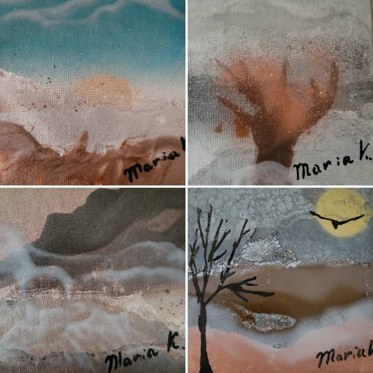 Isn't it fun figuring out how much content you can fit into a space barely bigger than your hand? Even more fun is to find out whether the scene you create speaks to the viewer. This little set offers four miniature winter scenes to ponder.