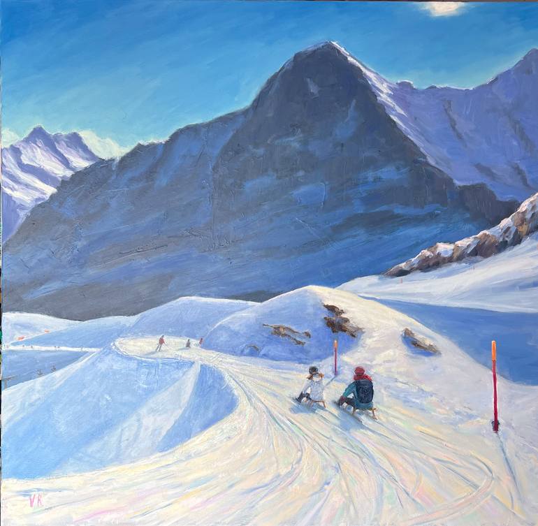 Embrace the joy of winter in Grindelwald with this stunning oil painting, ‘Winter Paradise.’ Featuring skiers and sleds gliding through fresh snow with the majestic Eiger towering in the background, this artwork captures the thrill of alpine adventure and the happiness of a perfect winter day. Ideal...