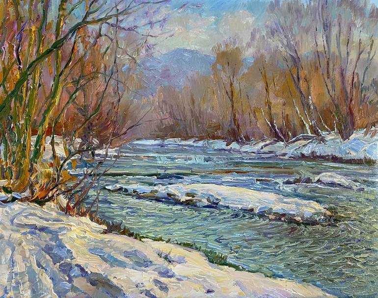 A captivating impressionist oil painting that beautifully captures a serene winter landscape. The river, partially frozen, flows gently through the snow-covered banks, reflecting the soft hues of the sky and trees. The artist masterfully blends warm golden tones of bare branches with the cool blues ...
