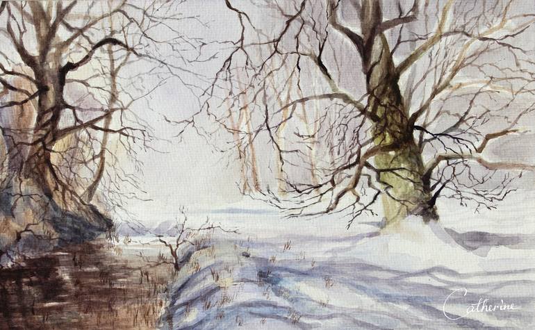 Watercolor landscape painting, 32 x 20 cm. One of the most Beautiful Seasons of the Year when the trees and everything around you gets covered with this beautiful white blanket with thousands and thousands of diamonds and stars, reflecting so brightly in the Sun, sparkling and shining so brightly an...