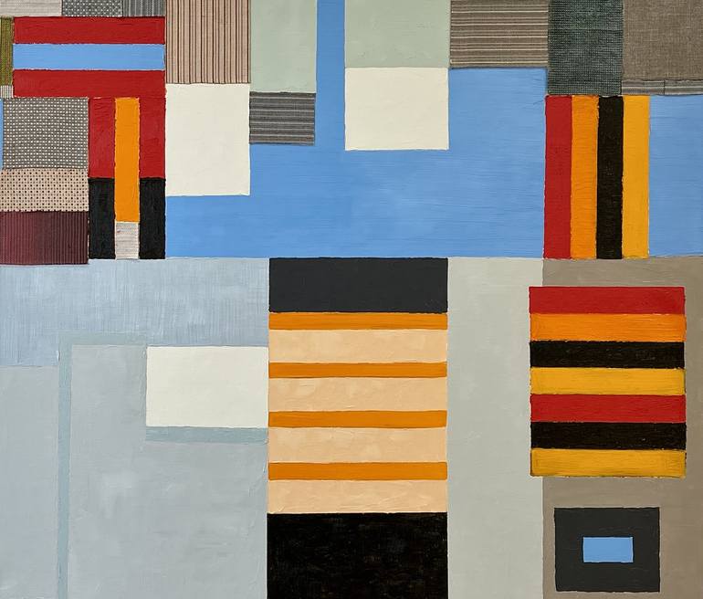 Painting : oil paint, oil sticks, textiles on coarse linen canvas / wood stretcher from Marin Beaux Arts, France. Paris, mid winter blue skies cold outdoors. Buildings rooftops, grey clouds, even brown clouds. Where I am and how I feel psychologically is what I will paint. Recently moved into a n...