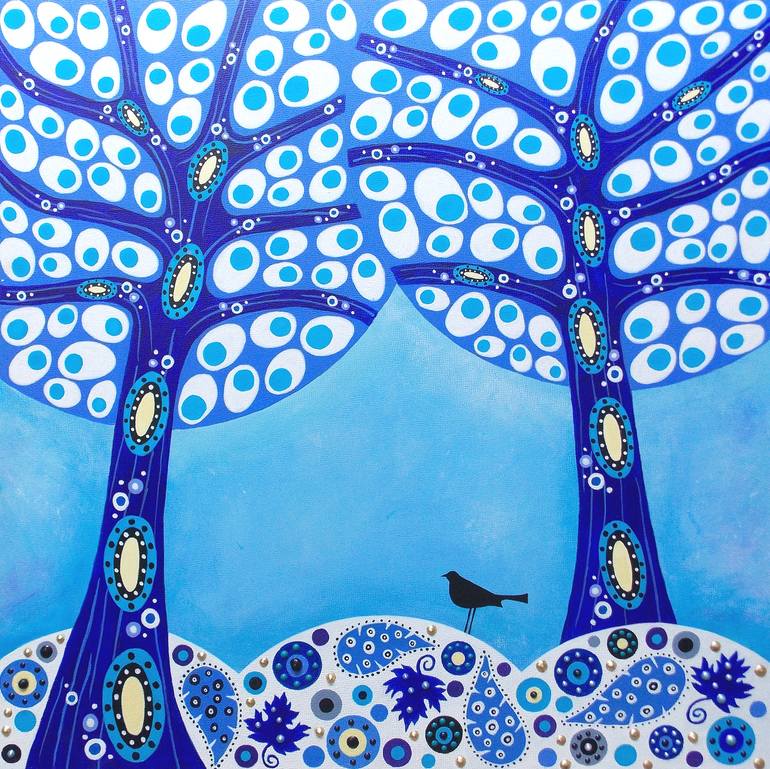 This is the final piece in my series of small-scale tree paintings that represent the four seasons. This one is evocative of winter with its crisp blue and white hues and the single little bird flitting about under the trees. Textural elements and the delicate application of gold leaf add to the rad...
