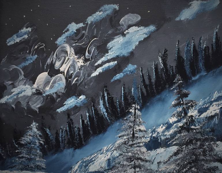 Do you like Winter? Do you find it as beautiful and magical as I do? Then you will like this painting.... It is enchanting with its blueish mist surrounding trees, and the snow is fresh on the land. It is a natural marvel that is untouched by humans. Go on, relax and enjoy this winter scenery.