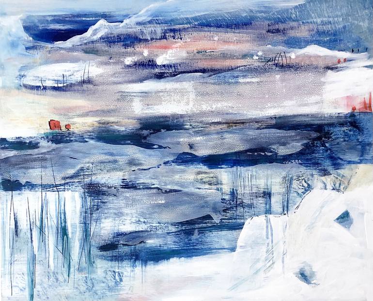 Winter day by water with ice and snow. There is on birch panel.