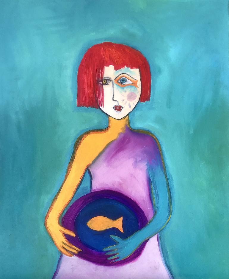 Original cartoon art . Fantasy painting. Wish Fairy girl with red hair and colourful hands with fish blend together fluently creating a magical fantasy composition. Figurative painting . Contemporary artwork in cartoon style. This artwork is fantasy art about Wish Fairy .She's so colorful and br...