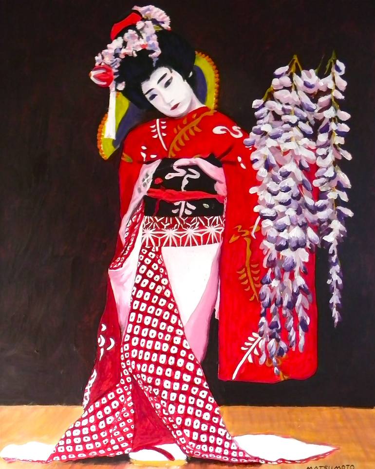 A young girl dancing a traditional Japanese dance called Fujimusume (Wisteria Girl). She is wearing a gorgeous red kimono and head dress and is holding a branch of wisteria. Despite her young age, she seems to be transformed into another dimension with her pensive look.