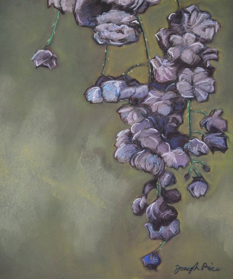 This floral pastel image was made after viewing beautiful purple wisteria flowers in a garden in Japan. The beautiful flowers caught my eye when they hanging from picturesque trellises late in their growing season. The purple beauty of the flowers was entrancing, and I found myself taking pictures t...