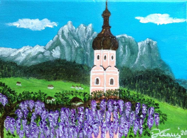 Landscape with mountains, the Dolomiti Mountains in Northern Italy, with wisteria in bloom in the foreground. Each work has its own CERTIFICATE OF AUTHENTICITY.