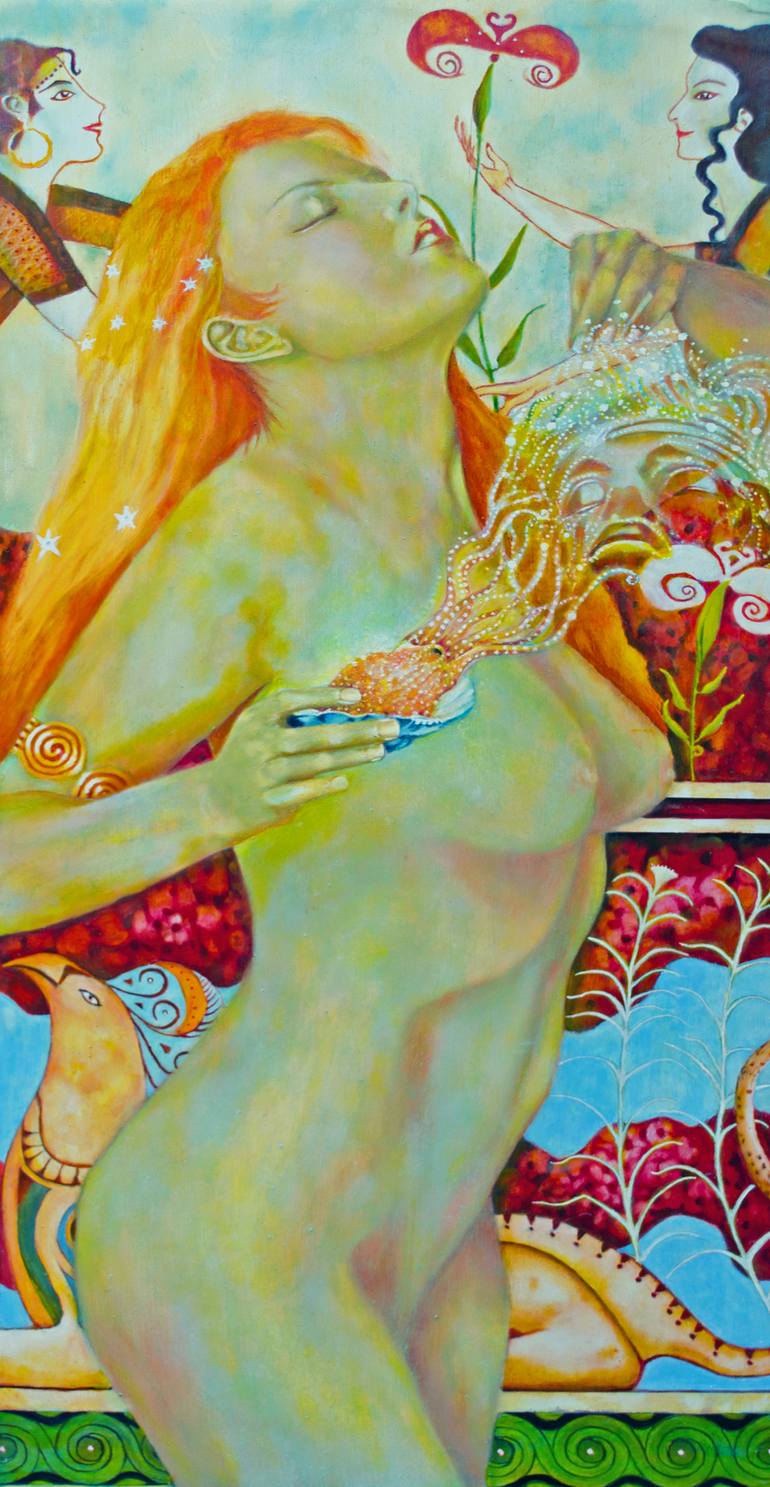 Witch” Circe Weaves Her Spell of Summoning, oil on wood, 48 inches by 24 inches, 2020 This dream vision painting depicts the enchantress Circe’ in her act of magically summoning Odysseus to her presence through adapt manipulation of her otherworldly skills. Her familiar, the cephalopod, excretes ...