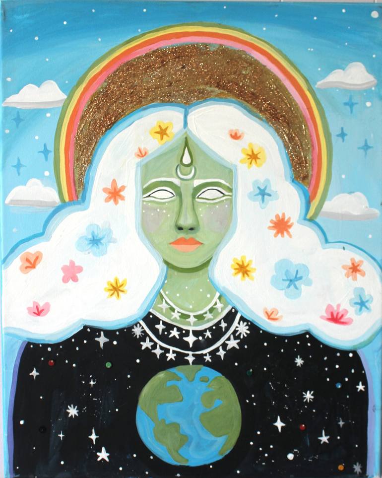A portrait of a woman whose actions are aligned with the earth. She loves the planet with all of her heart and projects that into the world. I used 60s imagery to create a witchy-looking woman at the dawn of the Age of Aquarius when people were beginning to wake up to the reality that we are all one...
